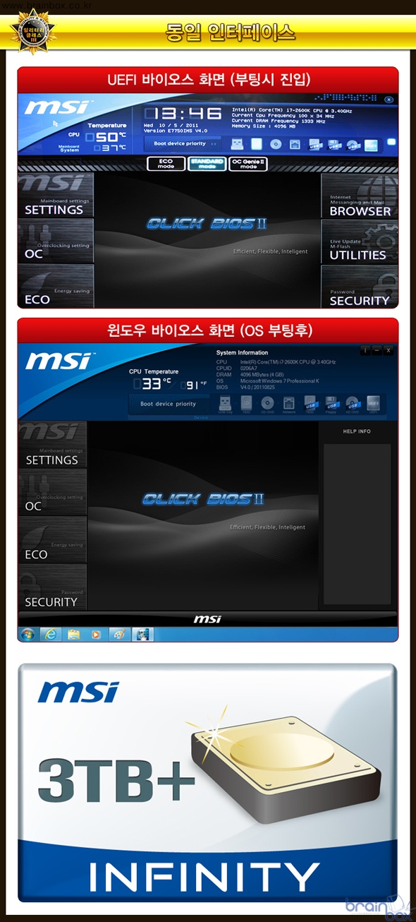 2개의 바이오스 셋팅 화면은 기본적으로 동일한 인터페이스를 채택하여 소비자의 혼동을 최소화 하였으며, 마우스를 통한 간편한 조작은 물론 최신 3TB 하드디스크까지 문제없이 사용할 수 있는 특징을 제공한다. AMD 크로스파이어X 공식 지원