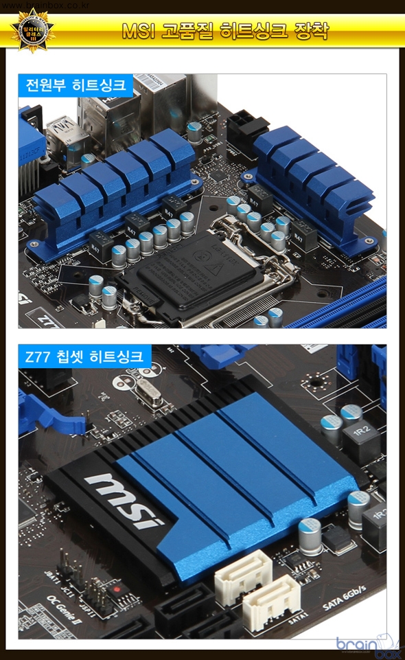 MSI Z77A-G43 Gen3 메인보드는 초보자도 간편하게 시스템 성능을 향상시킬 수 있도록, OC 지니 2 기술을 지원한다. 사용자는 별도의 복잡한 셋팅을 할 필요가 없이 OC 지니 2를 활성화 하는 것만으로, 간편하게 전체적인 시스템 성능을 향상시킬 수 있다. 고품질 히트싱크 디자인