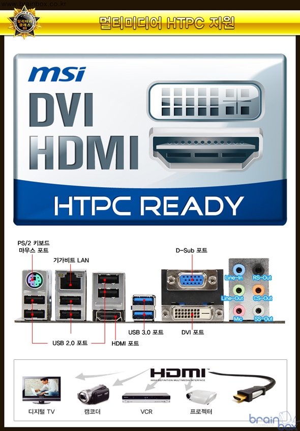 MSI Z77A-G43 Gen3 메인보드는 멀티미디어 HTPC를 구성할 수 있도록 다양한 디스플레이 포트를 기본 제공한다. HDMI / DVI / D-SUB 포트를 기본 제공하여 사용자가 원하는 디스플레이 장치에 연결할 수 있도록 지원하며, 8채널 HD 사운드 출력도 기본 지원하여 다양한 스펙의 멀티미디어 HTPC를 구성할 수 있다.