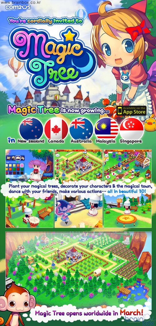 컴투스[078340](대표 박지영, www.com2us.com)가 개발한 세 번째 SNG ‘매직트리’가 글로벌 출시를 앞두고 3월 13일(한국시간 기준) 애플 앱스토어를 통해 캐나다, 호주, 뉴질랜드, 싱가포르, 말레이시아 등 5개 국가에 선 출시 되었다.