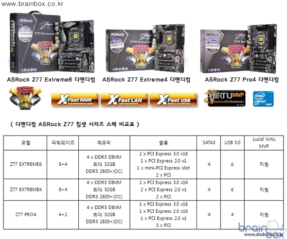 ASRock 의 공식 디스티인 디앤디컴㈜(대표 노영욱 www.dndcom.co.kr)에서 인텔 샌디브릿지 및 차세대 22nm 프로세서를 지원하는 Intel Z77 칩셋의 메인보드 3종을 출시했다. 이번에 출시한 모델은 ‘Z77 Extreme6, Z77 Extreme4, Z77 Pro4’이며, 3종 모두 ATX 폼팩터에 최대 32GB 메모리를 지원하는 4 x DDR3 DIMM 메모리 슬롯, 2800+(OC)의 메모리 속도를 자랑한다. 또한, 7.1채널 HD 프리미엄 Blu-ray 오디오와 THX TruStudio™사운드 칩셋을 지원해 현장감 넘치는 사운드를 제공하며, Digi Power Design의 전원부를 채택하고 SATA3 와 USB 3.0 슬롯의 탑재 수를 늘려 사용자들이 컴퓨터 환경을 최고성능으로 체험 할 수 있도록 해준다. Z77 시리즈는 높아진 사양뿐만 아니라 FPS 게이머들에게 꼭 필요한 기능이 탑재되어있다. HyperFormance™라고 하는 이 기술은 Lucid Virtu Universal MVP 패키지의 한 부분으로, 게임의 반응성과 프레임 율을 30-70% 향상, Vsync 프레임 율을 증가 시켜주고 Tearing 없이 화면을 더욱 선명하게 해준다. 그 외에도 애즈락 고유 기술인 XFAST 기술이 한 층 업그레이드 되어 5배 빠른 포토샵 등의 어플리케이션의 속도, 5배 빠른 게임에서의 대기시간, 5배 빠른 USB 전송속도를 자랑하는 555 XFAST 기능이 탑재 되었다. ‘ASRock Z77 Extreme6 디앤디컴’, ’ASRock Z77 Extreme4 디앤디컴’, ‘ASRock Z77 Pro4 디앤디컴’ 3종 모두 디앤디컴에서 3년 동안 무상으로 품질을 보증해 주며, 4월에 열릴 ASRock 디앤디컴 Z77 런칭 행사에서 시스템 및 제품을 전시할 예정이다.