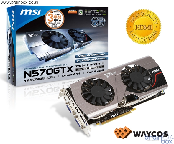 세계 최고의 VGA 제조 기술력을 갖춘, MSI의 한국 공식 디스트리뷰터인 ㈜웨이코스(대표:고민종) 가 최상의 쿨링 솔루션과 강화된 성능의 “MSI N570GTX 트윈 3 파워 에디션 HDMI 플러스” 그래픽카드를 출시했다. 소비자들에게 꾸준한 사랑을 받고 있는 MSI 지포스 570 시리즈 제품 출시를 기념하여 구매고객을 대상으로 사용 편의를 위해 MSI 전용 HDMI 케이블을 함께 제공한다. 최상의 트윈 프로져 3 쿨링 시스템