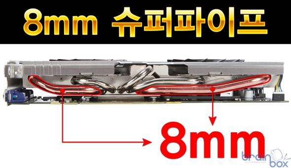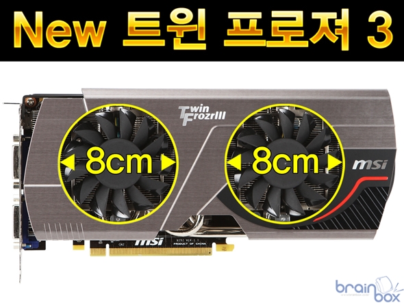 MSI 트윈 프로져 3 쿨링 시스템은 8cm 듀얼 팬을 장착하여 그래픽 카드의 발열량을 신속하게 제거할 수 있다. GPU의 발열량을 신속하게 히트싱크로 전달하기 위하여 5개의 히트파이프를 장착하고 있으며, 5개의 히트파이프 중 2개는 업계 최대 사이즈인 “8mm 슈퍼파이프” 로 구성하여 더욱 빠르고 신속하게 GPU 발열량을 제거할 수 있다.
