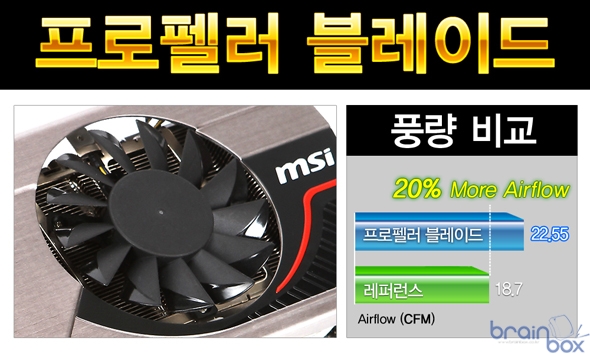 MSI 트윈 프로져 3 쿨링 시스템에는 기존 팬보다 성능이 향상된 “프로펠러 블레이드” 타입의 팬이 장착된다. 프로펠러 블레이드는 VGA에 더 많은 풍량을 제공하기 위해 MSI VGA 엔지니어링 팀이 연구 끝에 개발해 낸 독창적인 디자인의 팬으로써, 팬 날개 디자인 변경을 통해 기존 팬 보다 20% 더 많은 풍량을 히트싱크 및 VGA 기판에 공급할 수 있다.
