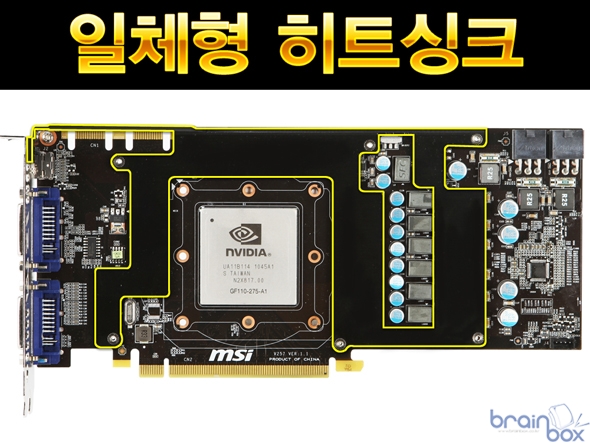 MSI N570GTX 트윈 3 파워 에디션 HDMI 플러스 제품은 메모리 / 전원부 및 기판 전체의 발열량을 흡수하여 제거하는 “일체형 히트싱크” 를 장착하여, 오버클러킹 환경에서도 낮은 기판 온도를 유지시켜 준다. 아울러 일체형 디자인으로 인해 쿨러의 장력으로 인한 “기판 휨 현상을 방지” 해주는 추가적인 장점 역시 기본 제공 한다.