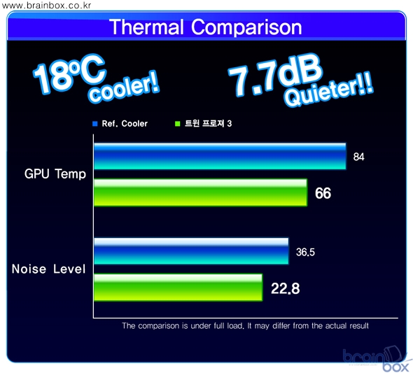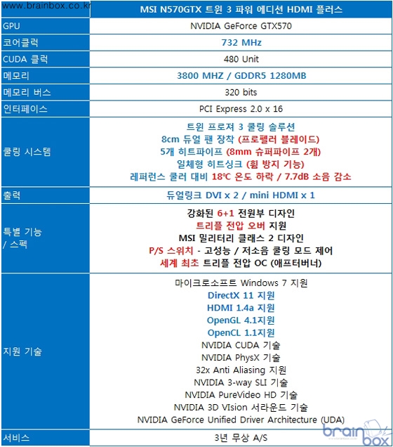 MSI N570GTX 트윈 3 파워 에디션 HDMI 플러스 제품은, 8cm 듀얼 팬 / 프로펠러 블레이드 / 5개 히트파이프 / 8mm 슈퍼파이프 / 일체형 히트싱크 디자인을 통해 레퍼런스 제품보다 18℃ 더 시원하고 7.7dB 더 조용한 특징을 제공한다. 강화된 6+1 페이즈 전원부