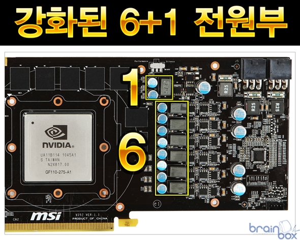 MSI N570GTX 트윈 프로져 3 파워 에디션 HMDI 플러스 제품은 레퍼런스 제품보다 강화된 6+1 페이즈 전원부를 제공하여 더욱 뛰어난 전원공급 능력을 제공하는 제품이다. 강화된 전원부를 기반으로 MSI N570GTX 트윈 프로져 3 파워 에디션/OC 제품은 레퍼런스 제품보다 40% 더 많은 전류를 GPU에 공급할 수 있다. 세계 최초 트리플 전압 오버