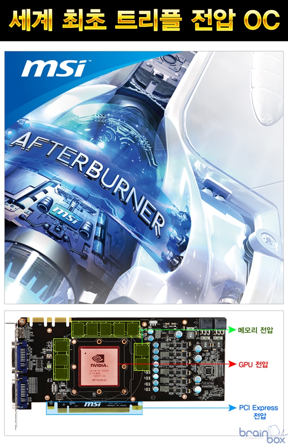 MSI N570GTX 트윈 3 파워 에디션 HDMI 플러스 제품은, 유명한 OC 및 튜닝 유틸리티인 “애프터버너” 를 통해 지포스 570 제품으로서는 세계 최초로 “트리플 전압 오버” 기능을 제공한다. 일반적인 OC 유틸리티와는 달리 “GPU?메모리-PCI Express 슬롯” 의 공급 전압을 조절할 수 있기 때문에 극한의 오버클러킹에 도전할 수 있는 특징을 제공한다. MSI 밀리터리 클래스 2 디자인