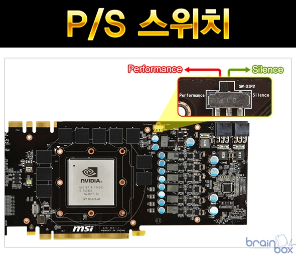 MSI N570GTX 트윈 3 파워 에디션 HDMI 플러스 제품은 P/S 스위치를 제공하여 쿨러의 동작모드를 사용자가 직접 설정할 수 있다. 기판 우측 상단에 위치한 P/S 스위치는 사용자가 직접 조작할 수 있으며, Performance (고성능) 모드는 보다 높은 쿨링 성능을 제공하며, Silence (정숙) 모드는 보다 조용한 쿨링 소음을 제공하는 특성을 제공한다. 사용자의 취향에 따라 P/S 스위치를 통해 쿨러의 동작 환경을 제어할 수 있기 때문에, 오버클럭에 관심이 높은 사용자는 Performance 모드를 통해 강력한 쿨링 성능을 제공받을 수 있으며, 저소음 PC 구현에 관심이 높은 사용자는 Silence 모드를 통해 그래픽 카드에서 발생하는 소음을 최소화 할 수 있다. |