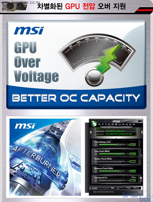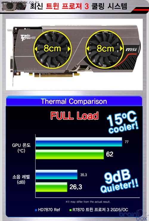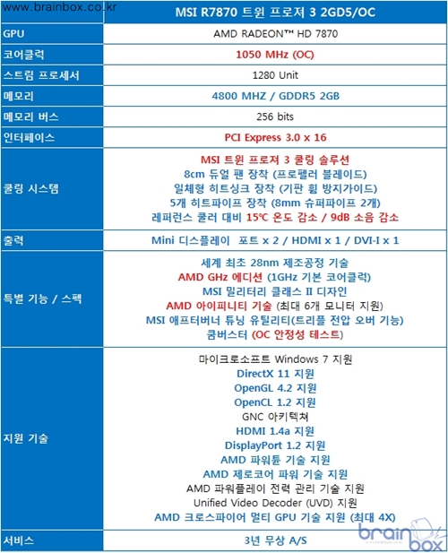 ![]() 세계 최고의 VGA 제조 기술력을 갖춘, MSI의 한국 공식 디스트리뷰터인 ㈜웨이코스(대표:고민종)가 AMD 최신 RADEON HD 7870 GPU를 장착한 “MSI R7870 트윈 프로져 3 2GD5/OC” 그래픽카드를 출시했다. MSI R7870 트윈 프로져 3 2GD5/OC 그래픽카드는 AMD 최신 그래픽 코어 ‘Pitcairn’ 로28nm 미세공정 기반에 1280 Unit 스트림 프로세서 갖추고 1050MHz GPU와 4.8GHz로 동작하는 차세대 GDDR5 2GB 메모리를 제공한다. 최상의 MSI 트윈 프로져 3 쿨링 시스템 ![]() MSI R7870 트윈 프로져 3 2GD5/OC 그래픽카드는 일반 레퍼런스 제품보다 더욱 강화된 냉각 성능을 제공하는 최상의 ‘프로펠러 블레이드’ 가 탑재된 트윈 프로져 3 쿨링 시스템을 장착한 제품이다. GPU 발열량을 신속하고 효과적으로 제거하기 위해 2개의 슈퍼파이프와 3개의 구리 히트파이프가 GPU에 직접 접착되는 디자인을 채택하였으며, 8cm 대형 듀얼 팬을 장착하여 20% 더 많은 풍량을 히트싱크와 기판에 직접 전달하여 15℃ 낮은 냉각 성능과 9dB 더 조용한 특성을 제공한다. 최신 PCI Express 3.0 공식 지원 ![]() MSI R7870 트윈 프로져 3 2GD5/OC 그래픽카드는 최신 인터페이스인 PCI Express 3.0을 공식 지원한다. 최신 PCI Express 3.0 인터페이스는 기존 PCI Express 2.0 규격보다 2배 더 많은 대역폭 (32GB/s)을 제공할 수 있으며 새롭게 출시되고 있는 Gen3 지원 메인보드와 곧 출시될 차세대 CPU를 통해 보다 향상된 게임 성능을 지원 할 수 있다. MSI Afterburner 유틸리티 ? GPU 전압 오버 및 프레데터 기능 지원 쿰버스터 유틸리티 ? 최적의 OC 클럭 테스트 지원 ![]() MSI R7870 트윈 프로져 3 2GD5/OC 그래픽카드는 MSI Afterburner 유틸리티를 활용하여 레퍼런스 제품 성능에 만족하지 못하는 사용자들이나 처음 오버클럭을 시도하는 사용자에게 편리한 기능성을 제공한다. MSI Afterburner 유틸리티를 통해 사용자는 GPU 클럭 / 메모리 클럭 / 팬 스피드 등을 자유롭게 조절 가능하며, GPU 전압 조정 기능을 통해 오버클럭 성능을 향상시키는 특성을 제공한다. 아울러 애프터버너 최신 버전에서는 자신이 플레이하는 게임 화면을 실시간으로 동영상 캡쳐할 수 있는 “프레데터” 기능이 추가되어 더욱 다양한 방식으로 활용할 수 있는 특성을 제공한다. 또한 오버클러킹 후 안정적인 동작 여부에 대한 테스트를 사용자가 직접 확인할 수 있도록 “쿰버스터” 유틸리티를 함께 제공하여 최적의 오버클럭을 손쉽게 찾아낼 수 있다. 고품질 All 솔리드 캐패시터 ? 안정적인 부품과 우수한 내구성 제공 ![]() MSI R7870 트윈 프로져 3 2GD5/OC 그래픽카드는 고품질 All 솔리드 캐패시터를 채택하여 더욱 안전하고 단단한 품질을 제공한다. 전원부에 적용된 고품질 솔리드 캐패시터는 우수한 안정성과 내구성을 제공하기 위해 알루미늄 코어로 구성되어 풀로드 상태인 열악한 환경에서 10년을 사용할 수 있으며 단순 오피스 환경에서는 57년의 긴 내구성을 제공한다. ESR 특성 부분에서도 기존 솔리드 캐패시터보다 30% 낮은 특성과 높아진 효율성에 낮아진 온도를 제공한다. AMD 아이피니티 기술 ? 최대 6대 모니터 지원 ![]() MSI R7870 트윈 프로져 3 2GD5/OC 그래픽카드는 멀티 디스플레이 출력을 지원하는 AMD 아이피니티 기술을 제공한다. 기본 제공되는 HDMI / DVI / Displayports 영상 출력 포트를 통해 4대 모니터 연결이 가능하며 2 DisplayPorts에 멀티 스트림 트랜스포트 허브(MST HUB)를 통해 최대 6대 모니터를 지원한다. 또한 AMD HD3D 기술을 지원하여 3D 게임과 영상, 사진 재생 시 부드럽고 깨끗한 고화질의 영상을 제공하며, HDMI 1.4a / DVI / Mini DisplayPort 등 다양한 그래픽 출력 포트를 제공하며, 7.1채널 고품질 오디오와 블루레이 3D 스테레오 포멧 기술을 지원하여 게임 및 멀티미디어 플레이 환경에서 최적의 기능성을 제공한다. ※ MSI R7870 트윈 프로져 3 2GD5/OC 공식 스펙 ![]() |