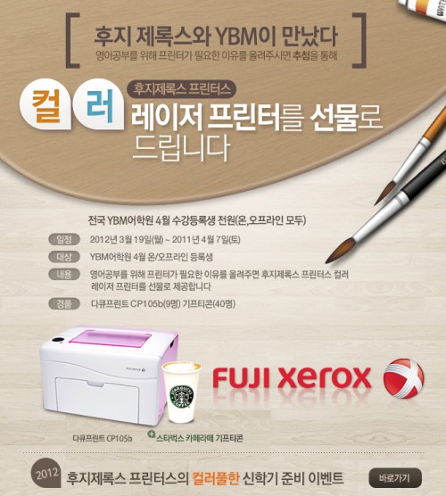 본 행사는 전국 YBM어학원의 4월 수강생을 대상으로 실시되며 추첨을 통해 컬러 레이저 프린터 (모델명 다큐프린트 CP105b) 및 스타벅스 카페라떼 기프티콘이 증정될 예정이다.