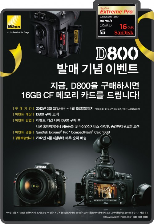 이번 이벤트는 D800이 정식 발매되는 오는 22일부터, 제품 구매 고객을 대상으로 실시된다. 참여를 원하는 고객은 4월 15일까지 D800 구입 후, 4월 23일까지 니콘이미징코리아 홈페이지(www.nikon-image.co.kr)에서 정품 등록과 무상서비스 연장 승인을 마치면 된다.