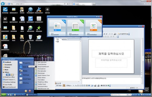 한컴이 미국의 유명 클라우드 컴퓨팅 기업인 ‘제로데스크탑(www.zeropc.com)’사와 기술제휴로 선보인 ‘씽크프리 웹-VDI’는 기존의 VDI 환경을 웹기반으로 구축, 최대 70% 저렴하고, 10배 이상의 동시 사용자 접속수를 지원하는 것이 특징이다.