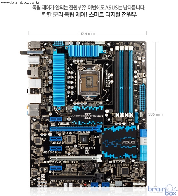 3세대 디지털 전원부 기술인 스마트 DIGI+ 기술이 적용된 ASUS P8Z77-V Deluxe 이번에 공개된 칸칸 분리 독립 제어 방식의 ASUS 스마트 DIGI+ 디지털 전원 부는 플러그쉽 모델들 뿐만 아니라 메인스트림 급 제품인 ASUS P8Z77-V 제품에도 적용되었다. 이러한 광범위한 신기술 적용으로 기존의 아날로그 혹은 1~2세대 초기형 디지털 전원부 설계가 적용되었던 메인보드 시장에서 "칸칸 분리 독립 제어" 방식의 3세대 디지털 전원부 방식이 새롭게 주도해 나갈 것으로 예상된다.