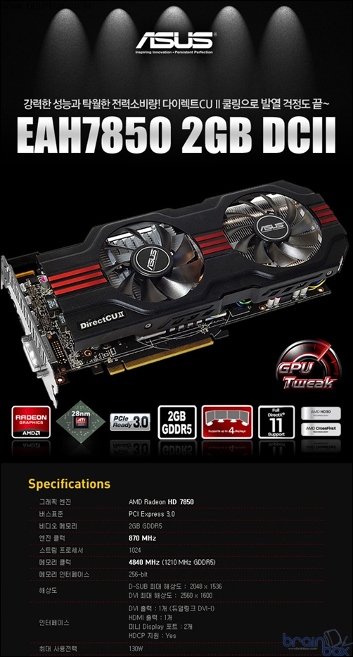 보여주는 그래픽카드 ASUS EAH7850 2GB DCll 를 출시한다. 이 그래픽카드는 지난 세대 대비 최대 60% 가량 전력 대 성능비가 향상되었으며, 일반 제품 대비 20% 이상 향상된 쿨링 성능을 제공하는 아수스만의 다이렉트CUll 쿨러가 탑재되어 있어 한다. 이를 통해 고성능 게임을 즐기면서도 더 적은 전력소모와 더 낮은 온도에서의 부품동작이라는 두마리 토끼를 모두 잡았다. ![]() ![]() - GPU까지 쿨한 그래픽카드 ASUS EAH7850 2GB DCll는 아수스에서 독자적으로 설계한 다이렉트 CU쿨러를 탑재해 일반 제품에 비해 20%까지 발열 제어 성능이 향상되었으며 쿨링팬 소음 또한 혁신적으로 감소시켜 준다. 그래픽카드의 표면의 대부분을 커버하고 있는 대형 방열판과 함께 플랫타입의 6mm 구리 히트파이프가 GPU와 직접 접촉해 더 빠르고 강력한 쿨링기능을 제공한다. 아수스의 다이렉트 CU쿨링 기술은 지난해 전세계에서 400개 이상의 어워드를 수상해 명실상부한 최고의 그래픽카드 쿨러로 군림하고 있다. ![]() ASUS EAH7850 2GB DCll 탑재된 2GB 메모리는 27인치 이상의 모니터를 사용하는 해상도인 2560 x 1440 등 풀HD 해상도 이상의 환경에서 그 본격적인 성능을 발휘한다. 또한 2개 이상의 멀티모니터를 사용하는 게이밍 환경에서도 그 진가가 발휘된다. 일반적으로 해상도가 크면 클 수록 더 큰 메모리 용량이 필요하게 된다. 특히 2560 x 1440 이상의 해상도에서는 기존 1GB 메모리로는 정상적인 그래픽처리가 어려워 앞으로 발매될 고사양 게임의 경우 2GB 이상의 고용량 그래픽 메모리가 필수적으로 필요하게될 전망이다. ![]() ![]() ASUS EAH7850 2GB DCll 는 세계 최초의 28nm 제조공정이 적용된 라데온 HD7850 칩셋을 장착해 지난 세대에 비해 저전력으로 동작하면서도 더 향상된 3D 처리 및 게이밍 능력을 갖추고 있다. 또한 PCI Express 3.0 인터페이스를 지원해 기존에 비해 두 배로 늘어난 32GB/s의 대역폭을 제공한다. 이를 통해 AMD 아이피티니 기술을 활용해 3대 이상의 모니터를 사용할 때나 3D 게임을 즐길 때 더욱 더 부드러운 동작 환경을 제공한다. ![]() - AMD 아이피니티 기술로 3대의 모니터 동시 지원 ASUS EAH7850 2GB DCll 는 AMD의 아이피니티 기술을 지원해 단일 그래픽카드로는 최대 3대, 크로스파이어 기술을 통해 2대 이상의 그래픽카드를 사용할 때에는 6대까지 모니터가 지원된다. 특히 3D 모니터도 최대 3대까지 동시에 지원해 상상 이상의 게임플레이 경험을 선사할 것이다. 또한 최신의 그래픽카드 모니터링 & 오버클러킹 유틸리티인 GPU Tweak이 기본적으로 포함되어 있다. ![]() GPU Tweak은 타사가 따라 올 수 없는 다양한 기술을 갖추고 있어 그래픽카드 유틸리티의 표준으로 자리잡고 있다. GPU 엔진 클럭 조정에 따른 자동 전압조절, 벤치마킹 점수향상을 위한 2D ON/OFF 기능, 강력한 게임 캡쳐 기능, 다양한 위젯 제공 등 다양한 유저 편의 요소를 갖추고 있다. 이처럼 하드웨어와 지원 소프트웨어가 최고의 시너지 효과를 발휘하는 아수스만의 "명품 유전자"를 지닌 그래픽카드가 ASUS EAH7850 2GB DCll 그래픽카드다. 기타 제품 관련 문의는 에스티컴퓨터(www.stcom.co.kr) 홈페이지 고객센터 또는 영업부(02-712-7828)로 문의하면 된다. |