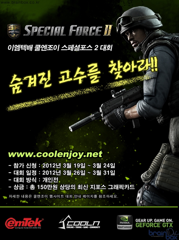 - 자격 제한없이 누구나 참가할 수 있는 <스페셜포스 2> 게임 토너먼트. 국내 컴퓨터 그래픽카드 시장을 선도하고 있는 (주)이엠텍아이엔씨(대표:이덕수)는 하드웨어 커뮤니티 쿨엔조이와 함께 인기 FPS 게임<스페셜포스2> 온라인 대회를 개최한다. "숨겨진 고수를 찾아라!!"라는 주제로 열리는 이번 <스페셜포스 2> 게임 대회는 온라인 대전으로 치뤄지며 경기 방식은 5명이 팀을 이뤄 상대방을 제압하는 일반적인 방식이 아닌 1대 1 매치로 개인 간의 기량을 겨루는 방식으로 진행된다. 대회 참가 신청은 3월 19일부터 접수 받으며 경기는 개인 토너먼트 방식으로 치뤄지고 3월 26일부터 예선전을 거쳐 3월 31일 대망의 결승전을 치룬다. 아울러 결승전은 인터넷 동영상 스트리밍 방송으로 실시간 생중계 될 예정이다. 이번 대회는 총 상금 150만원 규모로 대회 우승자에게는 NVIDIA에서 새로 발표할 차세대 하이엔드 그래픽카드를 비롯해 준우승자에게는 GeForce GTX 560 Ti, 3위 입상자에게는 GeForce GTX 560 그래픽카드가 상품으로 주어지며, 순위와 관계없이 가장 멋진 플레이를 보여준 참가자를 대회 MVP로 선정하고 GeForce GTX 560 그래픽카드가 상품으로 수여된다. 또한 대회 부가 이벤트로 대회 우승자를 예측하고 응원 메시지를 남기면 추첨을 통해 고급 게이밍 마우스와 USB 메모리를 증정하는 행사도 같이 진행된다.