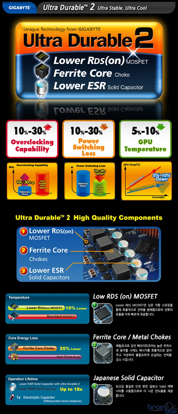 이 제품은 GIGABYTE社가 자랑하는 Ultra Durable 2(이하:UD2) 설계기술로 디자인 되어 최고 품질로 인정 받는 일본산 Solid 캐패시터 및 Low RDS MOSFET 을 사용함으로써 더 나은 전도율과 효율적인 전력 분배를 통해 전류의 흐름을 원활하게 제공한다. 또한 메탈 초크로 감싼 페라이트 코어는 에너지를 효율적으로 잡아주고 저장하여 불필요하게 손실되는 전력을 감소 시킨다.