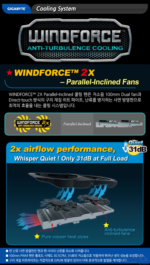 GIGABYTE社의 대표 쿨링 시스템 중의 하나인 Anti-Turbulence Cooling 방식의 WINDFORCE-2X 쿨링팬을 탑재하였다는 점 또한 이 제품의 특징이다. WINDFORCE-2X 쿨링 시스템은 저소음 100mm Dual-fan과 Direct-Touch방식의 구리 히트파이프, 난류를 방지하는 Parallel-Inclined(사면) 히트싱크가 장착되어 더욱 향상된 냉각성능을 제공할 뿐만 아니라 풀-로드 동작 시에도 단지 31dB의 저-소음 시스템 환경을 구축할 수 있다. ● 제품 스펙 |