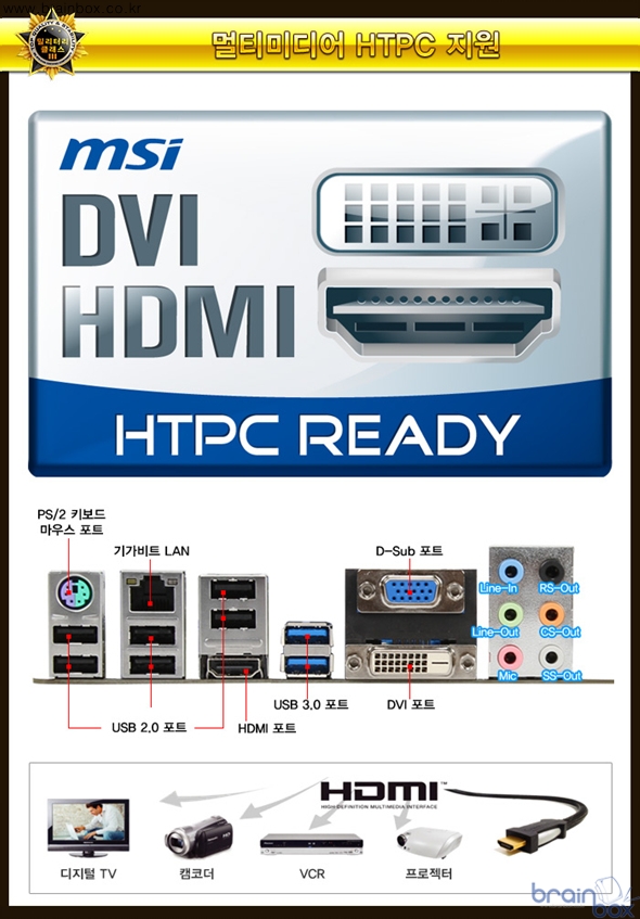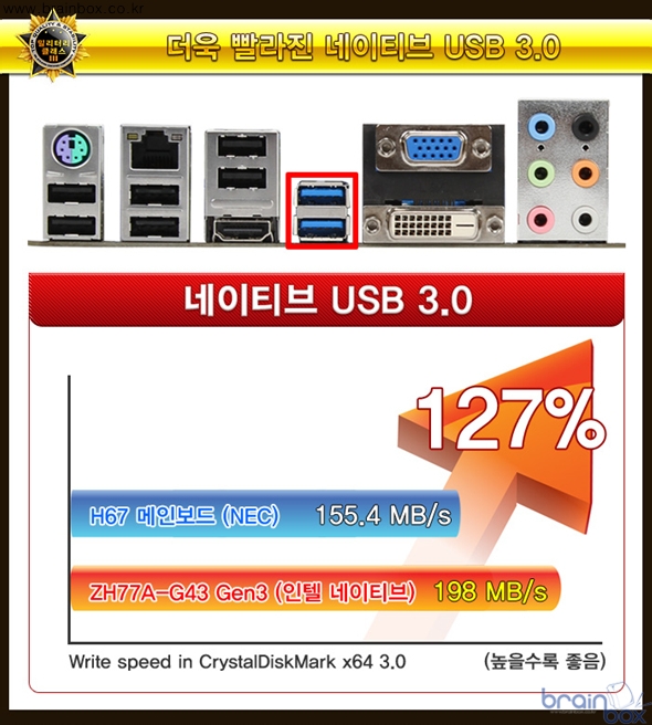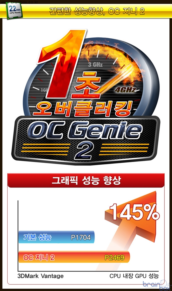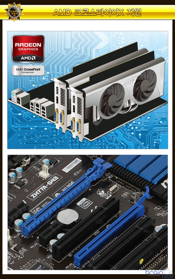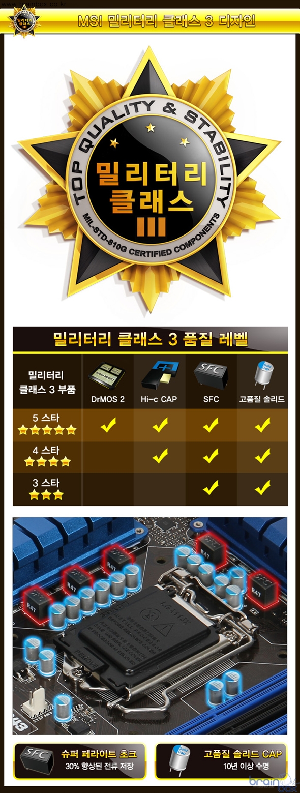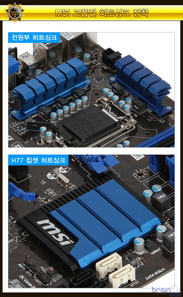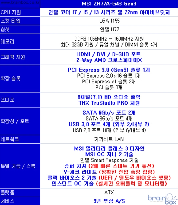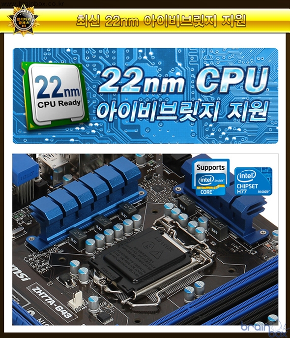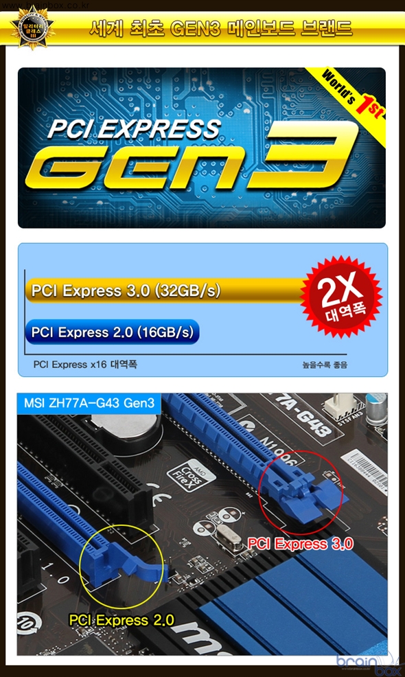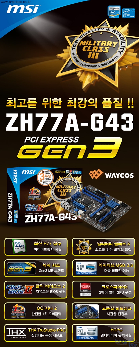 ![]() 세계 정상급 토탈 IT 솔루션 제조사, MSI의 한국 공식 디스트리뷰터인 ㈜웨이코스(대표:고민종)가, 인텔의 최신형 H77 칩셋을 장착한 “MSI ZH77A-G43 Gen3” 메인보드를 출시하였다. 22nm 제조공정, 차세대 아이비브릿지 CPU 지원 ![]() MSI ZH77A-G43 Gen3 메인보드는 인텔의 최신형 메인보드 칩셋인 H77 칩셋을 장착하여, 최신 22nm 제조공정으로 만들어진 차세대 “아이비브릿지” CPU를 공식 지원한다. 아울러 현재 판매되고 있는 샌디브릿지 CPU와도 문제없이 호환되기 때문에, 현재 시스템 구성은 물론 차후에도 최신 프로세서로 손쉽게 업그레이드 할 수 있는 특징을 제공한다. 더욱 강력해진 품질, MSI 밀리터리 클래스 3 디자인 ![]() MSI ZH77A-G43 Gen3 메인보드는 더욱 우수한 품질을 제공하기 위하여, 밀리터리 클래스 3 디자인을 적용하였다. 본 제품에 장착된 SFC (슈퍼 페라이트 초크) 는 기존 초크보다 30% 향상된 전류 저장능력 및 오버클러킹 환경에서도 안정적인 전원을 공급할 수 있는 특징을 제공한다. 아울러 전체 기판에 사용된 고품질 솔리드 캐패시터는 풀로드 상태를 기준으로 10년이라는 긴 수명을 제공하여, ESR 특성 부분에서도 기존 솔리드 캐패시터보다 30% 낮은 특성을 제공한다. ![]() ※ 밀리터리 클래스 3 부품이 통과한 테스트 (MIL STD는 미 국방성 통과 기준) - 습도 테스트 (Humidity Test) : (MIL STD 810G Method 507.5) - 저압 테스트 (Low Pressure Test) : (MIL STD 810G Method 500.5) - 고온 테스트 (High Temperature Test) : (MIL STD 810G Method 501.5) - 저온 테스트 (Low Temperature Test) : (MIL STD 810G Method 502.5) - 온도 충격 테스트 (Temperature Shock Test) : (MIL STD 810G Method 503.5) - 진동 테스트 (Vibration Test) : (MIL STD 810G Method 514.6) - 충격 테스트 (Shock Test) : (MIL STD 810G Method 516.6) MSI 밀리터리 클래스 3 디자인에 속한 부품들은 우수한 품질과 내구성으로, IST (Integrated Service Technology) 그룹의 공식 인증서를 발급 받았다. IST 는 다양한 하드웨어 제품의 품질과 안전성을 테스트하는 전문 연구기관으로, 습도 / 고온(발열) / 충격 / 진동 등의 다양한 테스트를 미 국방성이 제시한 기준과 동일하게 진행하여 이를 통과한 제품 및 부품에 대해서 품질 인증서를 발급하게 된다. 발급된 IST 품질 인증서는, 소비자가 직접 내용을 확인할 수 있도록 제품 박스 안에 기본 제공된다. 차세대 PCI Express 3.0 (Gen3) 공식 지원 ![]() MSI ZH77A-G43 Gen3 메인보드는 차세대 인터페이스인 PCI Express 3.0 을 공식 지원하는 제품이다. 차세대 PCI Express 3.0 인터페이스는 기존 PCI Express 2.0 인터페이스에 비해 2배 더 많은 대역폭(32GB/s) 을 제공한다. 더욱 빨라진 네이티브 USB 3.0 ![]() MSI ZH77A-G43 Gen3 메인보드는 기존 제품과는 다르게, H77 칩셋 자체에 USB 3.0 지원 기능이 포함되어 외부 USB 3.0 칩셋(NEC) 제품보다 더욱 향상된 데이터 쓰기 성능을 제공한다. 이로써 사용자가 USB 3.0 기기 사용시 보다 빠른 성능을 체감할 수 있다. 자유로운 BIOS 셋팅, 클릭 바이오스 2 ![]() ![]() MSI ZH77A-G43 Gen3 메인보드는 자유로운 바이오스 셋팅을 위하여 클릭 바이오스 2 기술을 제공한다. 클릭 바이오스 2 기술은 소비자가 자유롭게 바이오스 셋팅을 할 수 있도록, 기존의 UEFI 바이오스와 함께 윈도우(운영체제) 에서도 바이오스 셋팅을 할 수 있는 프로그램이 제공된다. 2개의 바이오스 셋팅 화면은 기본적으로 동일한 인터페이스를 채택하여 소비자의 혼동을 최소화 하였으며, 마우스를 통한 간편한 조작은 물론 최신 3TB 하드디스크까지 문제없이 사용할 수 있는 특징을 제공한다. AMD 크로스파이어X 공식 지원 ![]() MSI ZH77A-G43 Gen3 메인보드는 강력한 3D 게이밍 지원을 위해, 2웨이 크로스파이어X 멀티 그래픽 기술을 지원한다. 2개의 AMD 그래픽카드를 장착하여 3D 가속성능을 더욱 높일 수 있기 때문에, 최신 DX11 API를 지원하는 “배틀필드 3”와 같은 고사양 3D 게임도 부드럽고 빠르게 즐길 수 있다. 간편한 그래픽 성능향상, OC 지니 2 ![]() MSI ZH77A-G43 Gen3 메인보드는 초보자도 간편하게 CPU 내장 그래픽 성능을 향상시킬 수 있도록, OC 지니 2 기술을 지원한다. 사용자는 별도의 복잡한 셋팅을 할 필요가 없이 OC 지니 2를 활성화 하는 것만으로, 간편하게 내장 VGA 성능을 향상시킬 수 있다. 고품질 히트싱크 디자인 ![]() MSI ZH77A-G43 Gen3메인보드는 시원한 전원부 및 칩셋 쿨링을 위하여 고품질 히트싱크를 기본 장착하였다. 고품질 히트싱크를 장착하였기 때문에, 사용자가 오버클럭을 시도하더라도 보다 낮은 전원부 온도 및 칩셋 온도를 제공하여 OC 성공 확률 및 안정성을 더욱 향상시켜 준다. 실감나는 THX TruStudio PRO 사운드 ![]() MSI ZH77A-G43 Gen3메인보드는 집에서도 극장에서와 같은 고품질 사운드를 경험할 수 있도록 THX TruStudio PRO 사운드를 기본 지원한다. THX TruStudio PRO 사운드를 통해 소비자는 게임 / 음악 / 동영상 감상 시 더욱 생생하고 임펙트 있는 고품질 사운드를 체감할 수 있다. 멀티미디어 HTPC 지원 ![]() MSI ZH77A-G43 Gen3 메인보드는 멀티미디어 HTPC를 구성할 수 있도록 다양한 디스플레이 포트를 기본 제공한다. HDMI / DVI / D-SUB 포트를 기본 제공하여 사용자가 원하는 디스플레이 장치에 연결할 수 있도록 지원하며, 8채널 HD 사운드 출력도 기본 지원하여 