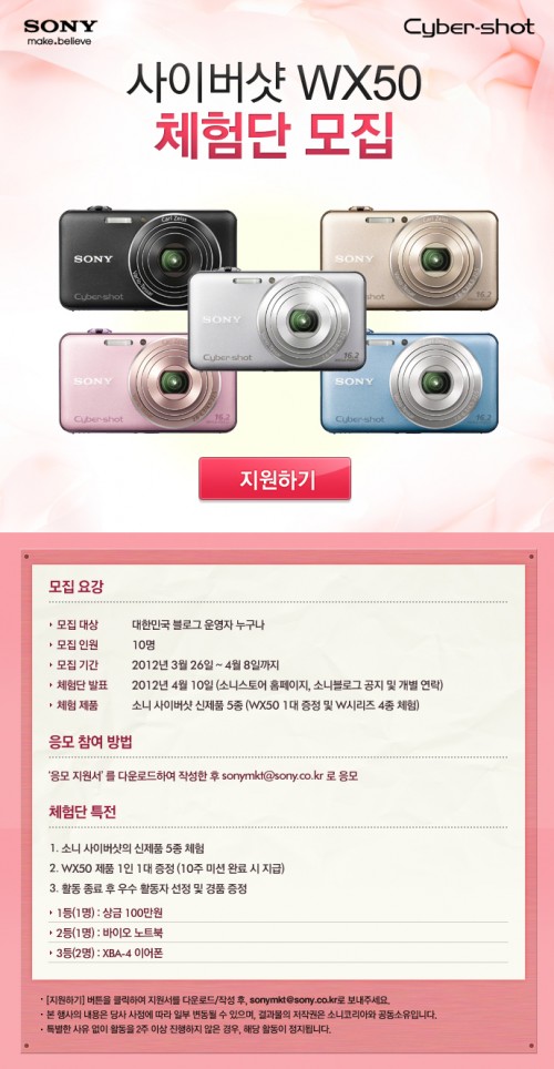 소니코리아는 독특한 나만의 사진을 만들 수 있는 WX50의 출시를 기념해 사이버샷의 매력을 전파해 줄 10인의 체험단 모집을 실시한다. 콤팩트카메라로 사진 촬영을 즐기며, 블로그를 운영하고 있는 대한민국 블로거라면 누구나 참여할 수 있으며 3월 26일부터 4월 8일까지 스토어 홈페이지 및 소니 블로그를 통해 지원할 수 있다. 선발된 체험단 전원에게는 소니 사이버샷 신제품 5종을 모두 체험할 수 있는 기회가 주어지며, 약 10주간의 체험을 모두 완료한 이에게는 WX50이 선물로 지급된다.