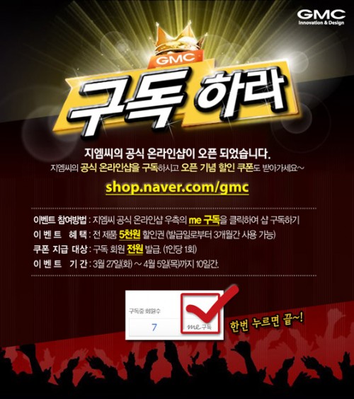 지엠씨는 이번 공식 온라인 샵 오픈을 기념해 할인 쿠폰 이벤트도 연다. 할인 쿠폰은 공식 온라인 샵을 구독하는 모든 회원에게 증정되며, 공식 온라인 샵 내 모든 제품에서 5천원을 할인 받을 수 있다. 샵 구독은 클릭 한 번으로 간단하게 가능하다.