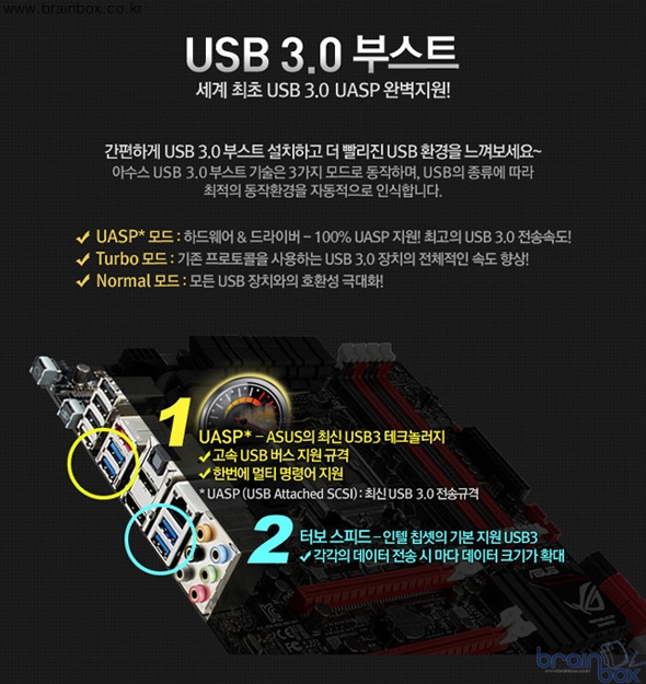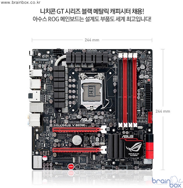 - 빛나는 레드라인으로 사운드 성능과 디자인 모두 만족 전원과 동시에 붉게 빛나는 강렬한 레드라인이 눈에 들어온다. 이 레드라인은 수려한 디자인뿐만 아니라 온보드 사운드칩의 성능을 향상시켜주는 아수스만의 장인정신이 담긴 설계다. 일반적으로 메인보드에 장착된 내장 사운드는 메인보드에서 발생하는 전자파장해(EMI)로 인해 출력되는 사운드 품질이 큰 폭으로 하락한다. MAXIMUS V GENE 메인보드에 설치된 "레드라인"과 "PCB 쉴드" 기술은 이러한 전자파장해를 원천적으로 차단해 음질저하를 최소화하는 아수스만의 독창적인 설계방식이다.