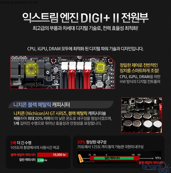 익스트림 엔진 Digi+ Ⅱ전원부에는 하드웨어 타입의 디지털 전원부 컨트롤러가 탑재되어 오버클러킹을 위한 가장 정교하고 극대화된 전력 효율성을 보장해준다. 일본산 블랙 메탈릭 초크는 일반 초크에 비해 높은 내열성과 내구성을 통해 5배 길어진 수명과 2.5배 향상된 성능을 갖추고 있다. 각각 독립적으로 하드웨어 방식으로 제어되는 익스트림 엔진 Digi+ Ⅱ전원부는 최적의 전원공급을 통해 최상의 컴퓨터 성능을 이끌어 낼 수 있다. 시스템이 사용할 수 있는 최대의 전력은 정해져 있지만, 하드웨어 방식으로 제어되는 전원부를 통해 에너지 절약과 극대화된 오버클러킹 성능을 이끌어 낼 수 있다. 강렬한 레드라인과 대비를 이루는 고급스러운 블랙 메탈릭 디자인으로 아수스 ROG 등급 메인보드의 품격을 느낄 수 있을 것이다.