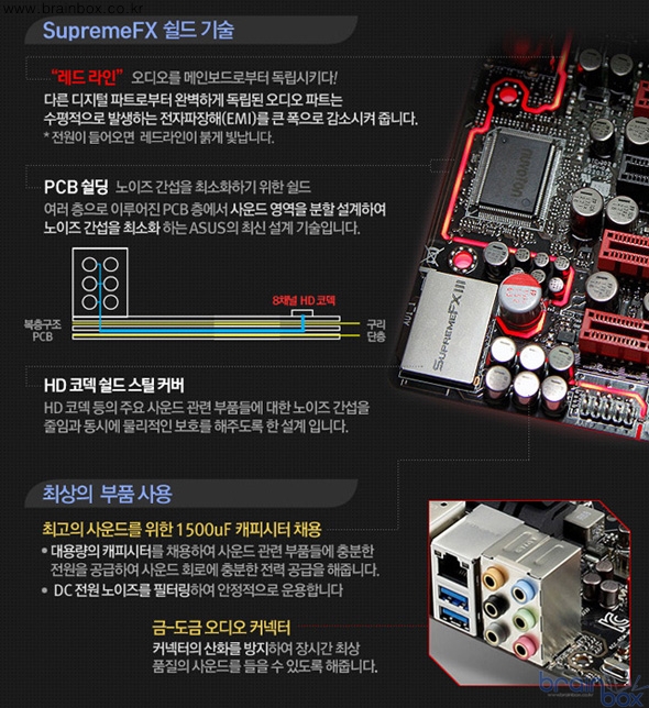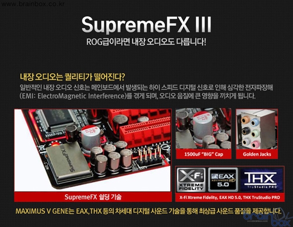 이런 뛰어난 메인보드 설계와 더불어 최강의 사운드카드 칩셋인 Supreme FX Ⅲ를 탑재해 110bB 무결점 출력을 자랑한다. 또한 대용량 사운드 전용 대용량 캐피시터를 장착햇으며 출력단자 금도금이 되어 있어 더욱 뛰어난 음질을 들려준다.