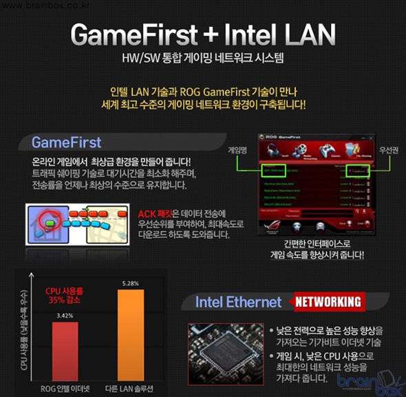 이 외에도 하이엔드 게이머를 위한 다양한 부가기능이 제공된다. 우선 게임 퍼스트 기능을 통해 온라인 게임플레이시 발생하는 "랙"을 줄여준다. 이 기능은 네트워크의 흐름을 관리해 온라인 게임도중 불필요한 랙을 감소시켜주는 기술이다. 이와 동시에 인텔 기가비트랜을 탑재해 일반 표준 랜 대비 CPU 사용률을 35% 가량 감소시켜 상대적으로 CPU의 성능을 강화해 준다. 또한 네이티브 USB 3.0을 지원하는 Z77 칩셋의 장점을 더욱 강화시켜주는 아수스 USB 3.0 부스트 기능과, LucidLogix virtu MVP를 지원해 최대 60%까지 향상된 그래픽가속 성능을 보여준다.
