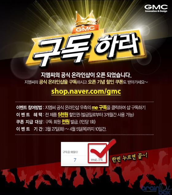 지엠씨의 공식 온라인 샵은 네이버의 새로운 쇼핑 서비스로 화제를 모으고 있는 샵N의 다양한 서비스와 함께 서비스된다. 별도의 회원 가입 절차 없이 네이버 아이디 그대로 이용할 수 있어 편리하며, 네이버 통합 마일리지의 적립 및 사용이 가능해 알뜰한 구매도 할 수 있다. 지엠씨는 이번 공식 온라인 샵 오픈을 기념해 할인 쿠폰 이벤트도 연다. 할인 쿠폰은 공식 온라인 샵을 구독하는 모든 회원에게 증정되며, 공식 온라인 샵 내 모든 제품에서 5천원을 할인 받을 수 있다. 샵 구독은 클릭 한 번으로 간단하게 가능하다. 제공되는 할인 쿠폰은 3월 27일부터 4월 5일까지 10일간 제공되며, 발급받은 날부터 3개월 간 사용할 수 있어 활용도가 높다. 쿠폰 발급은 1인당 1회만 제공된다.