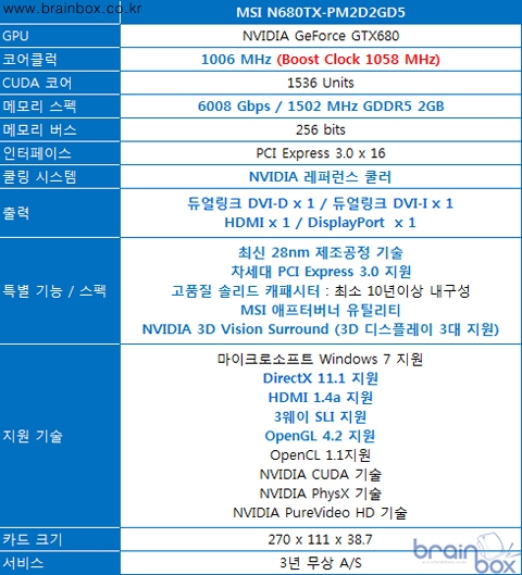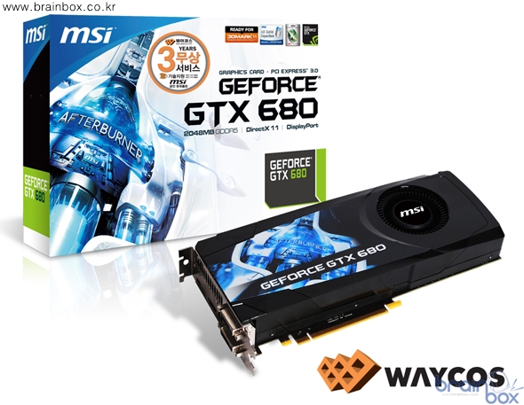 세계 최고의 VGA 제조 기술력을 갖춘, MSI의 한국 공식 디스트리뷰터인 ㈜웨이코스(대표:고민종)가 NVIDIA 최신 하이엔드 그래픽 코어를 탑재한 “MSI N680GTX-PM2D2GD5” 제품을 출시했다. MSI N680GTX-PM2D2GD5 제품은 최신 28nm 미세 공정의 NVIDIA ‘케플러’ 아키텍처 기반으로 1536개의 CUDA 코어를 내장하고 있고 1006 MHz로 동작하는 GPU 및 6008 Gbps 스펙의 차세대 GDDR5 2GB 메모리를 제공한다. 최신 PCI Express 3.0 규격 지원