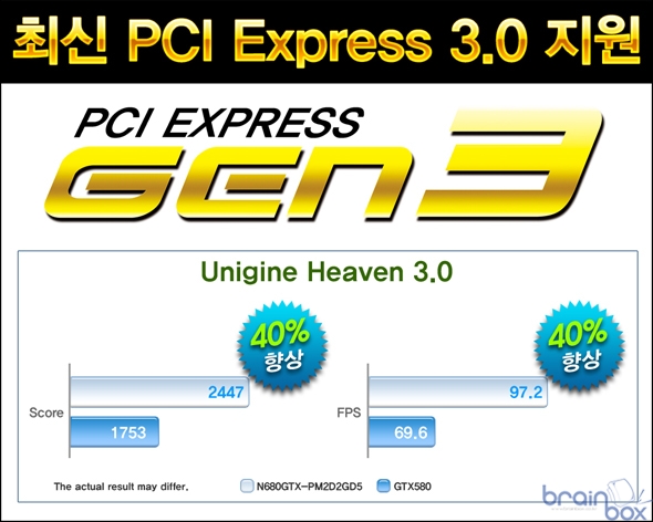 MSI N680GTX-PM2D2GD5 제품은 최신 인터페이스인 PCI Express 3.0 공식 지원한다. 최신 PCI Express 3.0 인터페이스는 기존 PCI Express 2.0 규격보다 2배 더 많은 대역폭(32GB/s)을 제공할 수 있으며, 최신 Gen3를 지원하는 메인보드와 곧 출시될 차세대 아이비브릿지 CPU를 통해 구현될 수 있다. NVIDIA GPU Boost 기술과 MSI 애프터버너 오버클러킹 지원