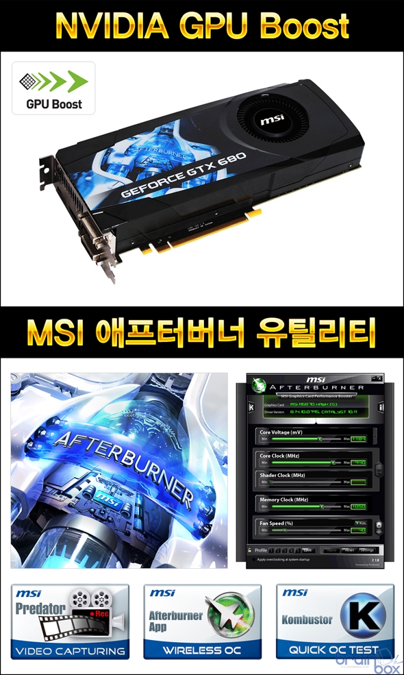 MSI N680GTX-PM2D2GD5 제품은 NVIDIA GPU Boost 기술을 통해 3D 게임의 특성과 환경에 따라 GPU의 클럭을 자동적으로 높여주어 최적화된 게임 성능을 제공한다. MSI N680GTX-PM2D2GD5 사용자는 MSI 애프터버너 오버클러킹 유틸리티를 통해 직접 GPU/메모리 클럭을 조절할 수 있어 잠재된, 그래픽카드 오버클럭 능력을 최대한 발휘할 수 있게 만들어 줄 수 있다. 아울러 지포스 6 시리즈를 위하여 새롭게 추가된 기능으로는 그래픽카드가 소모할 수 있는 최대 전력 소모량을, 사용자가 직접 조절할 수 있는 “Power Limit Control” 기능이 추가되었다. 게이머는 프레데터(Predator) 기능을 통해 자신의 게임 플레이 화면을 실시간으로 동영상 캡쳐를 할 수 있어 더욱 다양한 방식으로 게임을 즐길 수 있으며, 애프터버너 앱을 사용할 경우 iOS와 안드로이드 기반의 모바일 기기를 통한 애프터버너 기능의 무선 원격 조정이 가능하여, 다양한 방식으로 VGA 오버클러킹 및 모니터링이 가능한 특징을 제공한다.