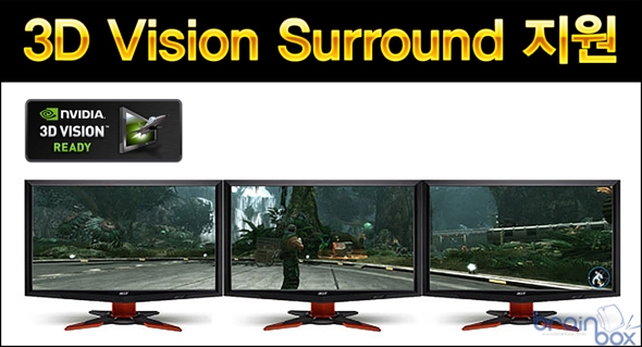 또한 애프터버너로 오버클럭을 한 뒤에, 안정적으로 동작하는 지 사용자가 직접 확인할 수 있는 “쿰버스터(Kombustor)” 유틸리티를 함께 제공하여, 최적의 OC 클럭을 찾아낼 수 있도록 지원하고 있다. 3D Vision Surround 지원