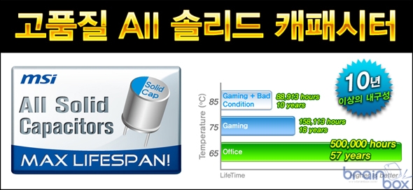 MSI N680GTX-PM2D2GD5 제품은 전체 기판에 고품질 솔리드 캐패시터를 채택하여 더욱 안정하고 단단한 품질을 제공한다. 알루미늄 코어로 구성된 고품질 솔리드 캐패시터는 오버클럭 및 Full-load 시에도 고주파 음이 없으며 10년 이상의 내구성을 보장한다. MSI N680GTX-PM2D2GD5 공식 스펙