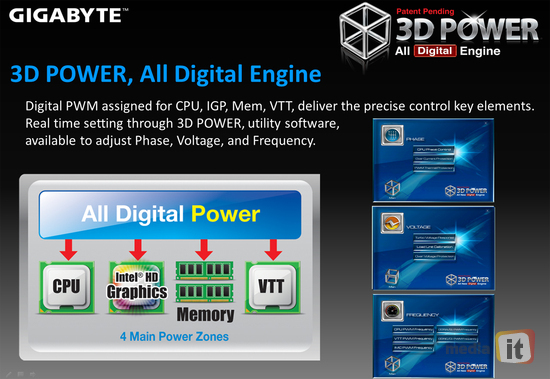 먼저 3D Power(All Digital Engine)는 기가바이트에서 특허를 갖고 있는 기술로 디지털 전력 공급 설계를 통해 넉넉히 전원 공급을 함으로써 시스템의 안정성을 높이고, 오버클럭에도 유리하다. CPU와 내장그래픽, 메모리와 VTT 등 주요 부품에 독립적으로 디지털 컨트롤러를 사용해 정확한 전원 공급을 할 수 있다.