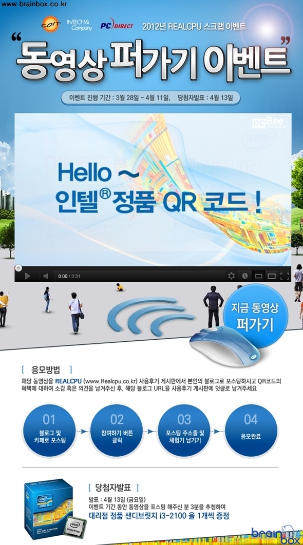 제조사 인텔에서 정품 프로세서 확인 솔루션 리얼CPU 웹사이트에 게재된 동영상을 첨부한 후기 이벤트를 진행한다고 밝혔다. 인텔은 정품QR코드, 또는 CPU의 제조번호(S/N)로 자신의 데스크탑PC에 탑재된 인텔 프로세서의 정품 여부를 확인할 수 있는 리얼CPU는 그레이, 벌크로 불리며 합법적이지 않은 경로로 판매되는 불법 프로세서 유통을 최소화 하여 소비자들의 권익 향상을 위해 진행되고 있다고 말했다. 동영상에는 퍼가기 버튼이 있어 EMBED CODE를 그대로 복사하여 네이버나 다음 포스팅 작성 화면에서 우측 하단의 HTML(네이버 기준) 버튼을 눌러 동영상 코드를 붙여넣기 한 뒤, 다시 Editor 버튼을 누르면 동영상이 추가된 것을 확인할 수 있다. 동영상과 함께 정품QR코드에 대한 진솔한 응원 메시지를 함께 포스팅 하고 리얼CPU 사이트의 참여하기 과정을 거쳐 자신의 블로그 및 카페의 주소를 남겨 응모할 수 있다. 이벤트 진행 기간은 3월 29일(시작일 제외) 4월 11일 까지 진행되며 당첨자 발표는 4월 13일날 리얼CPU사이트에서 확인할 수 있다. 해당 이벤트에 대한 자세한 내용은 아래 참고 사이트에 접속하여 확인할 수 있다. 리얼CPU 웹사이트 : http://www.realcpu.co.kr QR코드 홍보 동영상 링크 : http://realcpu.co.kr/web/news_cpu.html?mode=view&tname=nboard_c_news&idx=207 ![]() |