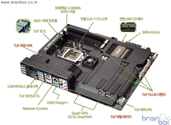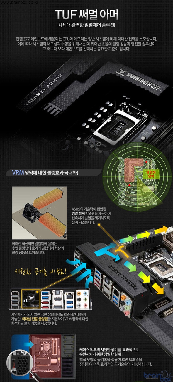 세이버투스 Z77 메인보드는 기존 TUF 시리즈의 핵심 기술인 써멀 아머 , 써멀 레이더, 더스트 디펜더를 더욱 강화하여 최고의 안정성과 내구성을 보여준다.