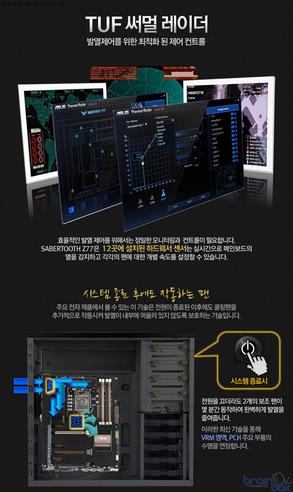 TUF 써멀레이더는 위와 같은 뛰어난 하드웨어를 컨트롤할 수 있는 최적의 소프트웨어라 할 수 있다. 메인보드 주요부 12곳에 설치된 열감지 하드웨어 센서인 써멀레이더 솔루션을 통해 메인보드에 설치된 쿨링팬의 속도, 온도 등을 간단한 UI를 통해 실시간으로 체크하고 설정할 수 있다.