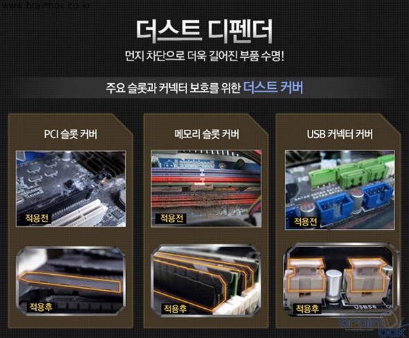 컴퓨터의 최대 적이라고 할 수 있는 먼지유입에 대한 보호를 더욱 강화하여 주요 핵심슬롯과 커넥터를 보호하기 위한 더스트 디펜더 설계도 적용되었다.