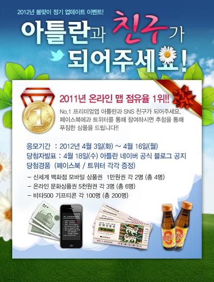 참여 방법은 아틀란 페이스북 페이지(www.facebook.com/atlanmap)에서 좋아요를 누르고 해당 이벤트 게시물에 공유 버튼을 누르거나, 아틀란 트위터 (www.twitter.com/atlan3d)를 팔로우 하고 이벤트 트윗을 RT 하면 된다. 이벤트 경품은 신세계 백화점 상품권, 온라인 문화상품권 등으로 다양하며, 추첨을 통해 총 210명에게 증정된다.