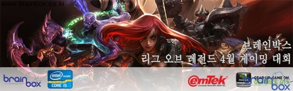 이후 3개월만에 국내 PC방 점유율 순위 1위를 차지한 후 현재까지 유지하고 있다. 브레인박스에서 주최하며 인텔 코리아, 엔비디아 코리아, 그리고 이엠텍의 후원으로 개최되는 "브레인박스 LoL 4월 게이밍 대회"는 4월 4일부터 4월 12일 24시 정각까지 9일간 참가자 신청을 받으며, 매주 토요일과 일요일 오후 5시부터 10시까지 방송을 진행할 예정이다. 게이밍 대회 신청방법은 브레인박스 LoL 커뮤니티, 대회예선 게시판에 참가신청 글을 작성하면 된다. 대회 진행은 5명의 멤버가 한 팀을 이루어 대전하는 게임의 특성상 오프라인 참여가 힘든 이들을 고려해 아프리카 방송으로 온라인 생중계된다. 상품 역시 5인으로 이루어지는 팀구성에 맞게 준비되었다. 우승한 팀에게는 "이엠텍 지포스 GTX550 Ti XENON Master DDR5 1G" 그래픽 카드 5개를 준비해 팀 전원에게 1개씩 증정하며, 아쉽게 준우승을 한 팀에게는 30만원 상품권, 3등 팀에게는 10만원 상품권을 증정한다. 기타 경기에 대한 세부사항은 브레인박스 LoL 커뮤니티, 공지사항 게시판에서 확인할 수 있다. 브레인박스 벤치마크 LoL 커뮤니티 http://www.brainbox.co.kr/lol ![]() ![]() ![]() |