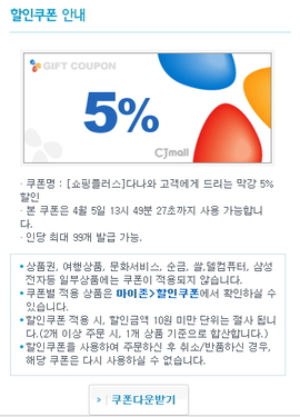 다나와와 CJ몰이 함께 진행하는 5% 할인쿠폰 프로모션이 4월 3일부터 진행 중이다. 기존 CJmall 할인 혜택