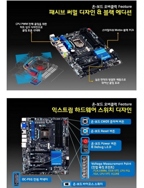 GA-Z77X-UD3H 메인보드는 오버클럭커들을 위한 편의 사양으로 순도 100% 알루미늄 재질의 넓은 방열판 채용으로 CPU PWM 전체와 칩셋 쿨링을 위한 패시브 써멀 디자인을 바탕으로, 오픈 케이스 상태에서 메인보드 튜닝 시 손쉬운 PC 제어를 위한 온-보드 Power 버튼, CMOS Clear 버튼 및 Reset 버튼이 채용됐으며, 시스템 포스팅 에러 발생 시 손쉽게 문제를 확인 할 수 있도록 Debug L.E.D가 적용됐다.