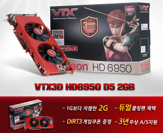 이번 가격인하를 통해 'VTX3D HD6950 D5 2GB'은 27만 9000원에 판매된다. 이는 1GB의 메모리 용량을 갖는 HD6950 제품과 비교해 저렴한 가격이다. 여기에 듀얼 쿨링 팬과 DiRT3 쿠폰제공 및 3년 쿨러 및 소모품을 포함한 무상보증서비스 지원 등 다양한 서비스가 제공된다.