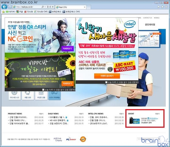 인텔은 이 밖에도 다양한 이벤트를 진행하고 있다. 리얼CPU 홈페이지 우측 하단을 보면 현재 진행되고 있는 이벤트들을 순서대로 볼 수 있으며, 더 보기 버튼을 클릭하거나 이미지를 클릭하면 인텔에서 진행하는 모든 이벤트를 확인할 수 있다. 2월 08일 현재 리얼CPU 홈페이지에서 9가지 이벤트가 진행되고 있다. 해당 이미지를 클릭하면 이벤트에 대해 보다 자세한 사항을 확인할 수 있다. 각 이벤트는 조이젠, 스마트피씨, 아이클럽, 팝콘피씨, 니즈컴, 컴퓨존, 해커쇼핑몰, 아이코다, 피씨포올이 참여하고 있다.