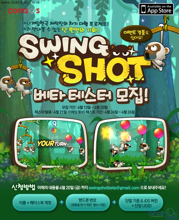 스윙샷!(가제)’ 베타 테스트 앞두고 베타 테스터 모집 4월 20일까지 진행 - 4월 24일부터 26일까지 3일간 베타 테스트 실시해 게임 체험 및 상품 증정 혜택 제공 - ‘아슬아슬 스윙샷!(가제)’, 전 세계 유저와 실시간으로 즐기는 코믹 발랄 캐주얼 네트워크 대전 게임 컴투스[078340](대표 박지영, www.com2us.com)는 자사가 개발한 캐주얼 게임 ‘아슬아슬 스윙샷!(Swing Shot)(가제)’의 5월 글로벌 애플 앱스토어 출시를 앞두고 베타 테스트를 실시한다고 전했다. ‘아슬아슬 스윙샷!(가제)’은 캐주얼 네트워크 대전 게임으로, 나무에 아슬아슬하게 매달린 상대방의 동물을 돌멩이, 열매, 벌집 등 다양한 무기 아이템으로 공격해 나무에서 떨어뜨리는 액션의 재미를 선사한다. 게임에 등장하는 동물들의 생동감 넘치고 코믹한 모션이 돋보이며, 실시간 네트워크 대전 모드는 물론 싱글 아케이드 모드도 지원해 혼자 가볍게 즐길 수도 있다. 컴투스는 ‘아슬아슬 스윙샷!(가제)’ 출시를 준비하며 4월 24일부터 26일 까지 3일간 베타 테스트를 진행한다. 베타 테스터 모집은 4월 20일 까지 실시되며 신청자는 이름과 페이스북 계정, 핸드폰 번호, 단말기 UDID와 본인의 단말기 기종 및 iOS버전을 기록해 신청 이메일 (swing shotbeta@gmail.com)로 보내면 된다. 참가자는 21일 본인의 이메일을 통해 선정 여부 확인이 가능하고, 베타 테스터가 되면 ‘아슬아슬 스윙샷!’을 먼저 체험할 수 있는 기회와 함께 추첨을 통해 다양한 선물을 받는 혜택도 누릴 수 있다. 베타 테스트 참가 신청에 관한 보다 자세한 내용은 컴투스 홈페이지 (www.com2us.com) ‘출시예정게임’ 코너에서 확인할 수 있다. ![]() |