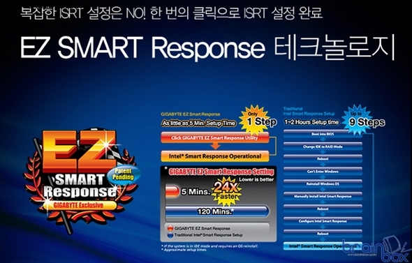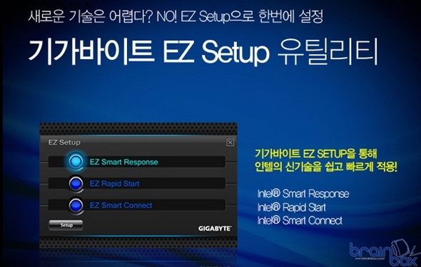 기가바이트 GA-H77M-D3H 메인보드를 통해 EZ Setup 유틸리티를 적용할 경우, SSD 스마트 캐싱을 구현할 수 있는 인텔 Smart Response 기술을 한 두번의 클릭으로 구현하여 기존의 일반 HDD 성능을 최대 4배까지 향상 시킬수 있으며, 절전모드에서 신속한 시스템 웨이크-업 구현 및 시스템 대기모드에서도 실시간 네트워킹 연결 가능케하는 "인텔 Rapid Start 기술"과 "인텔 Smart Connect 기술"을 초보자도 손쉽게 구현할 수 있다.
