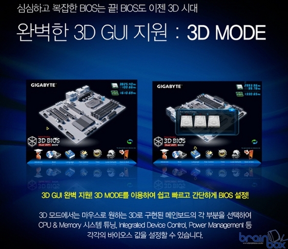 또한, 기가바이트의 최신 메인보드에 적용된 듀얼 3D BIOS(Dual UEFI BIOS)를 탑재하여 기존의 일반적인 UEFI 인터페이스 BIOS와 큰 차별화를 둔 것도 눈에 뛴다. 사용자 환경에 맞게 새로운 인터페이스의 입체적인 3D 모드와 전문가를 위한 Advanced 모드를 제공하여 기존 Legacy BIOS와 일반 UEFI BIOS가 따라올 수 없는 바이오스 컨트롤의 편의성을 제공함과 동시에, BIOS 리커버리 시스템까지 내장되어 있어 편의성과 안정성을 모두 겸비한 것이 특징이다.