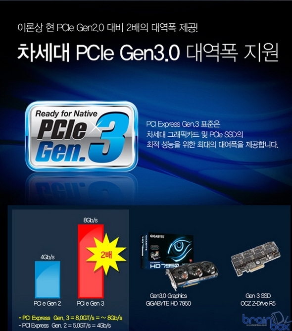 추가적으로, 차세대 PCIe Gen2.0 대비 최대 2배의 대역폭을 제공하는 PCIe Gen3.0 슬롯을 지원하여, nVIDIA Geforce 600 시리즈와 AMD HD7000 시리즈 등 최신 고성능 그래픽카드의 뛰어난 게이밍 성능을 즐길 수 있으며, 높은 대역폭을 기반으로 한 PCIe 타입의 SSD 사용 시에도 그 성능을 100% 구현할 수 있다.